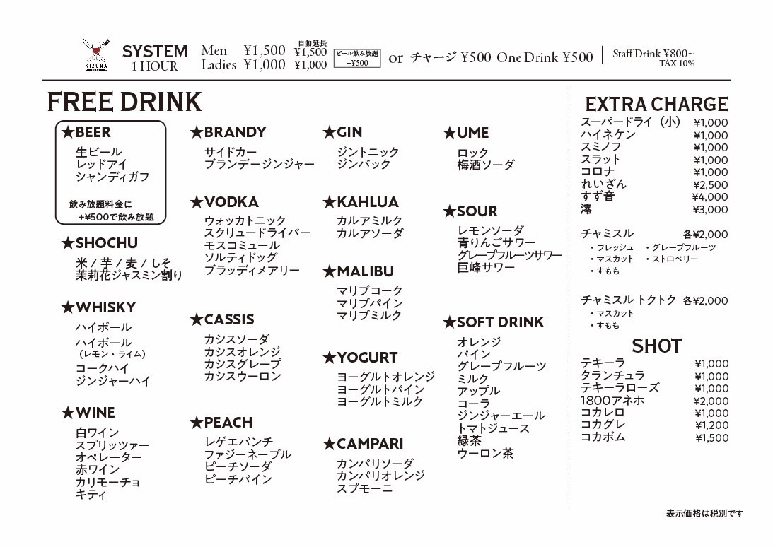 お気軽にお問い合わせください KIZUNA フードメニュー フードメニュー ドリンクメニュー ドリンクメニュー 街ナビクーポン 飲み放題女性1時間1000円男性1時間1500円 店舗情報 店名 KIZUNA 住所 熊本市中央区下通1丁目6-17 駐車場 電話 08083940814 ウェブサイト 営業時間 19時〜 定休日 不定休 アクセス